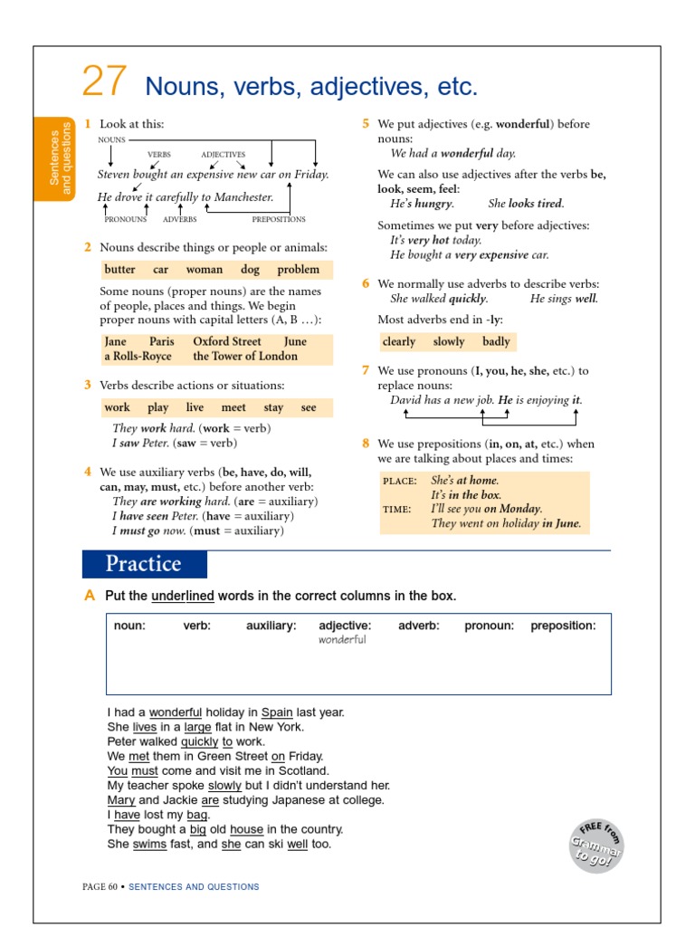 A word or group of words that expresses an action (such as eat), an event (such as happen) or a state (such as exist) Sentence (verb) the thief was sentenced to 5 years of imprisonment. An example of a verbal noun in english is 'sacking' as in the sentence the sacking of the city was an epochal event (sacking is a noun formed from the verb sack). Adjectives are describing words (rainy, spotty, huge, green) Using nouns as verbs many english words can be used in more than one part of speech.